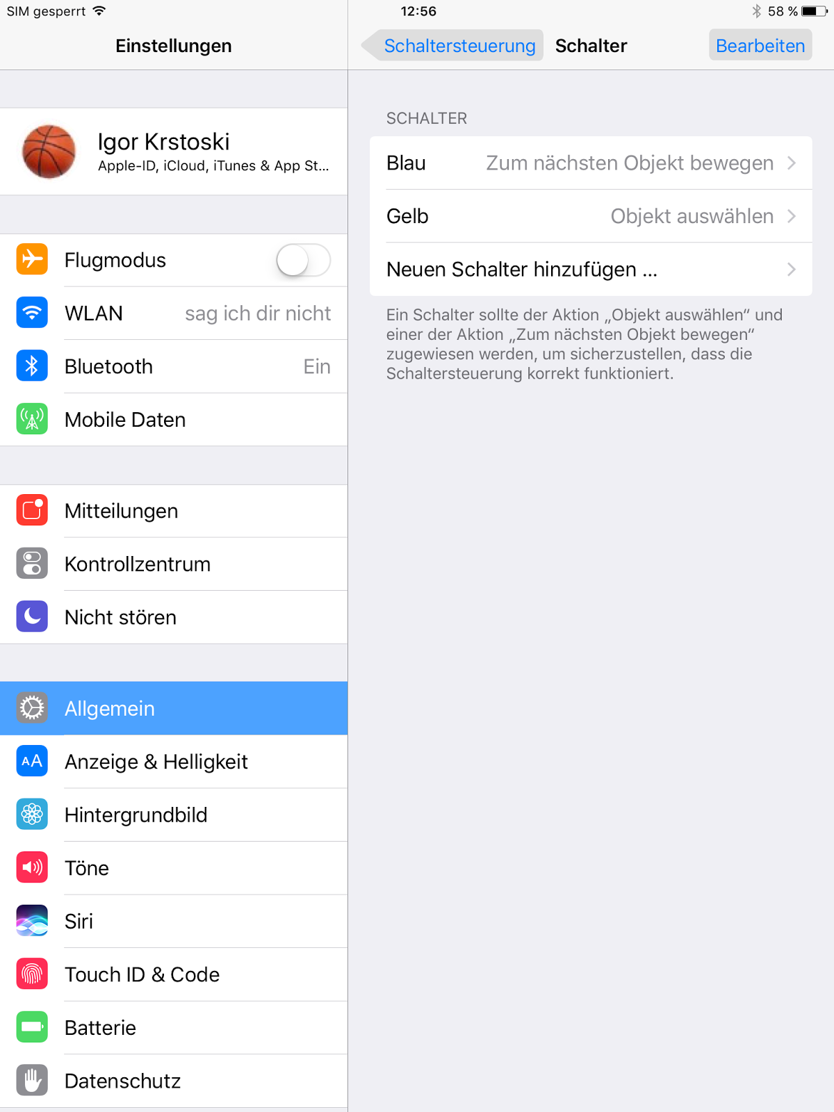 Ihr definiert zuerst die Schalter unter Bedienungshilfen/Interaktion/Schaltersteuerung – ihr nutzt hierfür die Interaktionen, wie im Bild!
