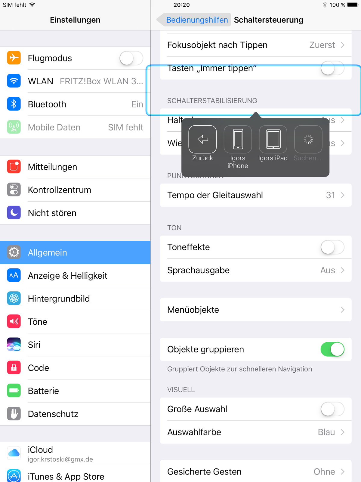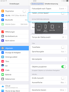 Wenn man das Scanning aktiviert, und die Auswahl „mehr“ öffnet, erscheint dieses Fenster (welches im Scanning-Mode gescannt wird). In der untersten Zeile man die Option „Anderes Gerät“. Wählt man diese Option, erscheint dann das iPhone (hier in diesem Beispiel) und man kann dann mit dem iPad ein anderes Gerät ansteuern.