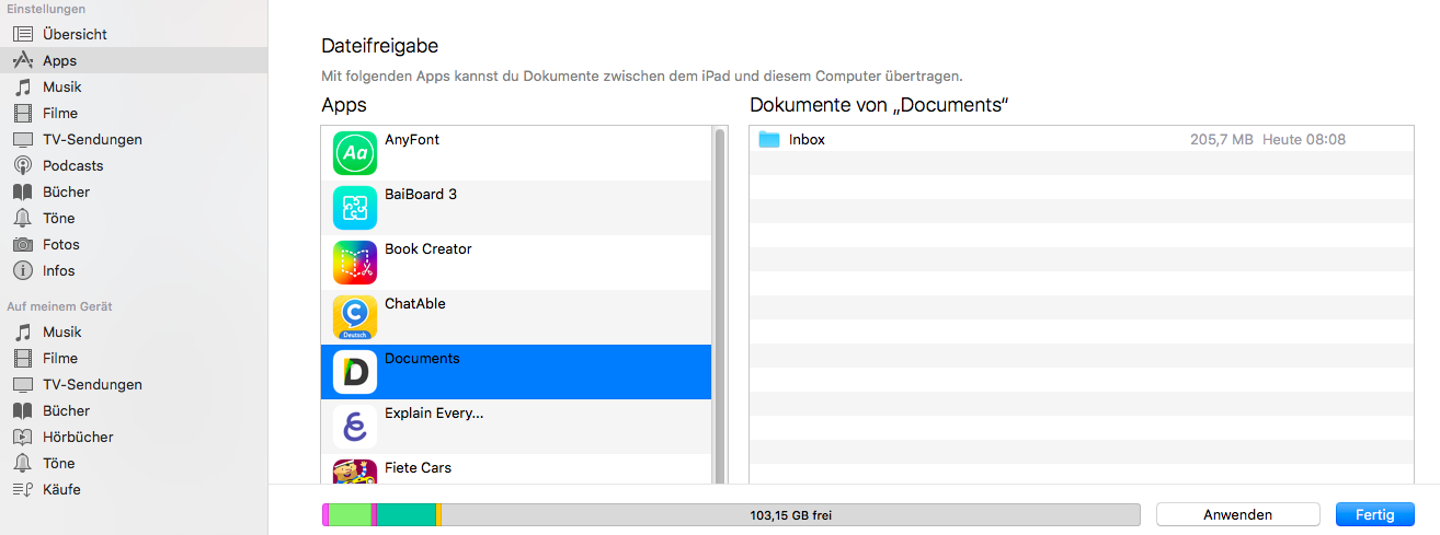 Öffnet nun Documents auf dem iPad. Im Ordner „iTunes-Dateien“ findet ihr nun die synchronisierten PNG-Ordner.